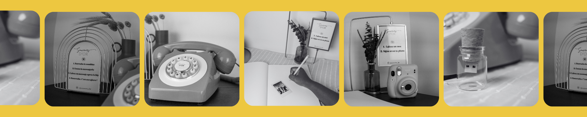 Louez notre téléphone d’or seul ou avec votre livre d’or personnalisé et appareil photo instantané.